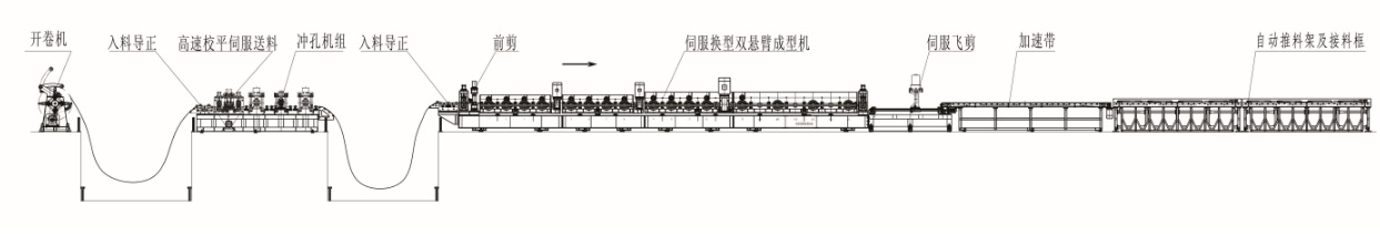 開卷機(jī)---入料導(dǎo)正--伺服送料--沖孔機(jī)組---導(dǎo)正---前剪---成型部分---伺服飛剪----加速帶----自動碼垛機(jī)