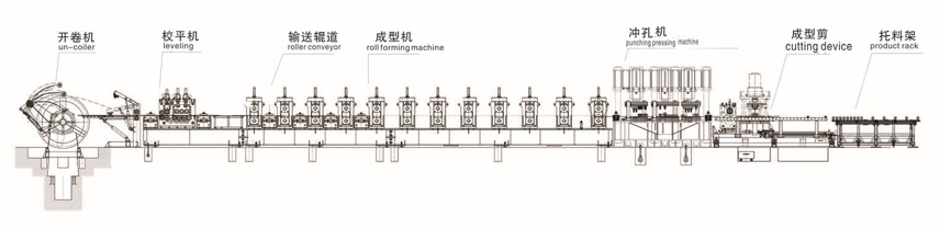 TF鋼板倉(cāng)加強(qiáng)筋生產(chǎn)線具備中板開卷、校平、輥壓成型,定長(zhǎng)沖孔、剪切、卸料等自動(dòng)化流水生產(chǎn)功能。每一成型道次單獨(dú)電機(jī)驅(qū)動(dòng),節(jié)能減耗;主機(jī)一套輥輪模具可生產(chǎn)1.5-8mm厚的型鋼制件;專用大型壓力機(jī),整體沖孔,確保裝配位置高精度要求;